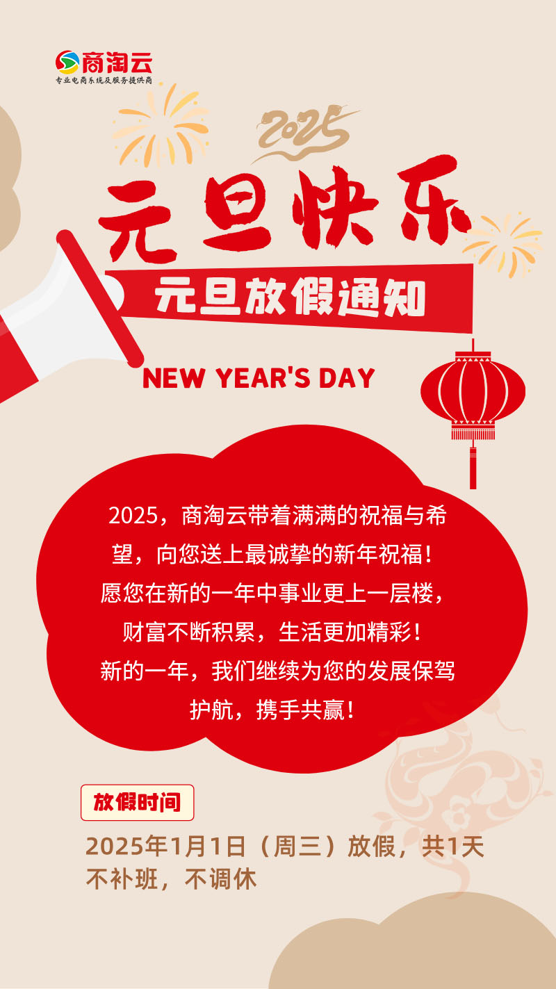 2025,商淘云帶著滿滿的祝福與希望,向您送上最誠摯的新年祝福! 愿您在新的一年中事業(yè)更上一層樓,財富不斷積累,生活更加精彩! 新的一年,我們繼續(xù)為您的發(fā)展保駕護航,攜手共贏!