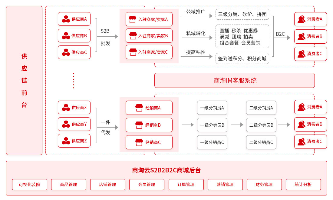 多渠道銷售支持:商淘云S2B2B平臺不僅支持傳統(tǒng)的批發(fā)交易模式,還能夠通過線上渠道(如電商平臺)進行多元化銷售,幫助批發(fā)商擴大市場覆蓋面,提升銷售額。