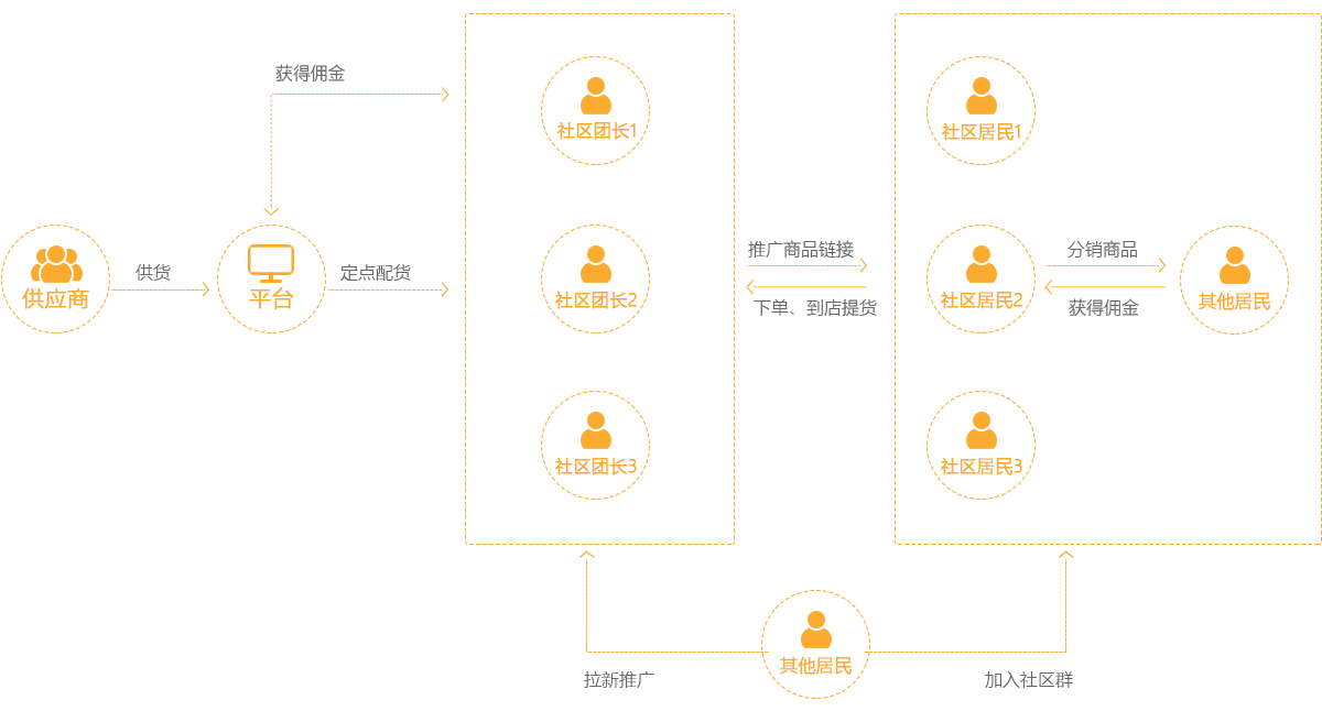 平臺(tái)引入供貨商入駐,憑借商城銷(xiāo)售數(shù)據(jù)選擇銷(xiāo)售量較好的商品供團(tuán)長(zhǎng)選擇適合當(dāng)?shù)匦^(qū)居民的商品,每天有新品。