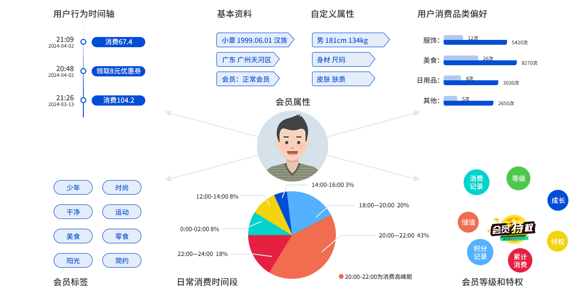 通過用戶信息、消費(fèi)行為進(jìn)行會(huì)員畫像,使用大數(shù)據(jù)分析,為會(huì)員定制個(gè)性化的營(yíng)銷方案