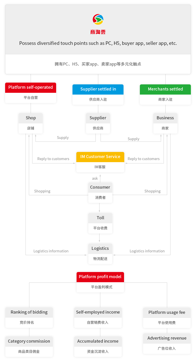 商淘云多用戶商城系統(tǒng)站支持自營、商家入駐、分銷等多種運營模式,完美打通各渠道,聚集消費群體,完整電商交易鏈,商家運營更精準。